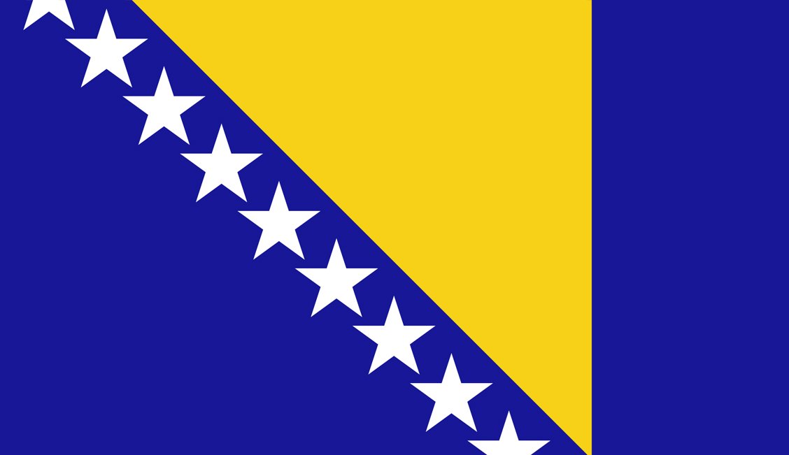 The flag of Bosnia and Herzegovina consists of a wide medium blue vertical band on the fly side with a yellow isosceles triangle abutting the band and the top of the flag. The remainder of the flag is medium blue with seven five-pointed white stars and two half stars top and bottom along the hypotenuse of the triangle. The three points of the triangle stand for the three nations of Bosnia: Bosniaks, Croats, and Serbs. It is said to represent the map of Bosnia.